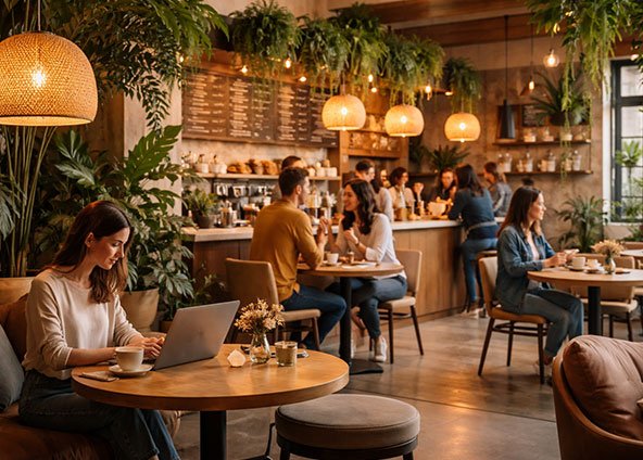 A modern café interior crafted with warmth and style — designed to create a cozy atmosphere for coffee, conversations, and memorable experiences.